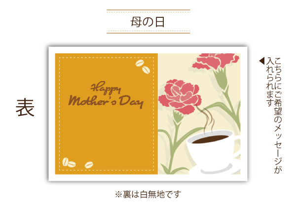 あなたの気持ち、お伝えしませんか?(無料メッセージカード承ります) カードのデザインは4種類からお選びいただけます。 カード裏面に記載するメッセージを備考欄にてお書きください。(50文字以内) ※絵文字や特殊記号は文字化けしてしまう場合がございますので、お控えください。 (!?♡♪はご利用いただけます)